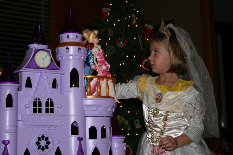 | Brynn received this Rapunzel wedding gown from Auntie Christel and Uncle John. Here she is in front of the castle. |