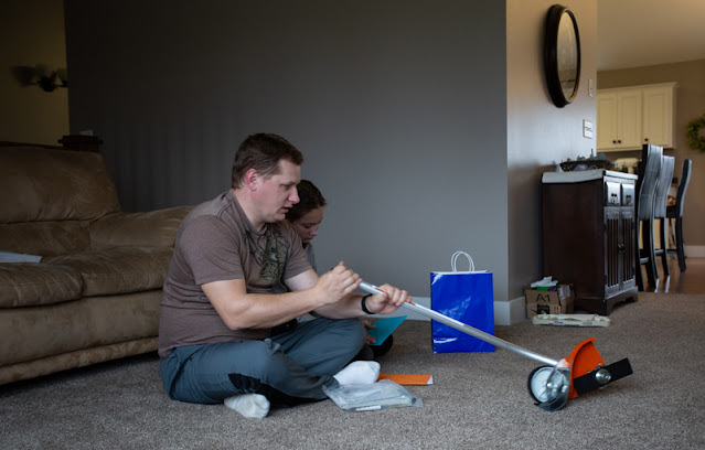 On Sunday we were pretty low key. The girls and I made Dana's birthday cake (same one as last year: chocolate peanut butter cup) and then we opened gifts and ordered in dinner.